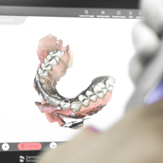 Für implantierende Eingriffe nutzen wir eine virtuelle 3D-Operationsplanung. Dabei berechnet ein Computer aus mehreren Bildern des Mundraums ein 3D-Modell. Dieses schafft eine detailgenaue Ansicht und ermöglicht die Planung und Umsetzung optimaler Implantat-Lösungen.